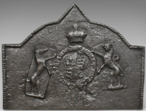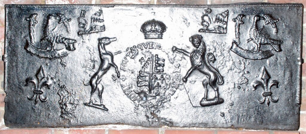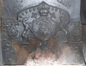 The combination of supporters is a guide to which sovereign’s reign the arms relate. The greyhound had originally been one of the supporters of the arms of Henry VII together with a dragon representing Wales, and also of Henry VIII in the early years of his reign. Although she most commonly used lion and dragon supporters, some heraldic authorities cite the use of the greyhound by Elizabeth I with a lion, so the arms displayed on this group of firebacks would appear to be from the reign of Elizabeth.