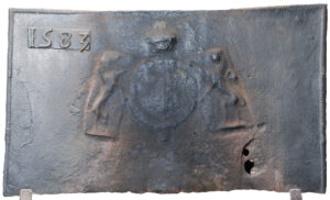 A similar situation is suggested with two other firebacks both with a date of 1583. Again the firebacks to which the dates have been added are different in their size, edging and proportions and are well worn. The numbers are clearly shown mounted on a backing block and, this time, the style of the figures is more appropriate to the date they claim to be. If, as the supporters suggest, the four dated firebacks are from the reign of Elizabeth, which began in 1558, the corrosion affecting the armorials on each of them seems disproportionately advanced for use over what would have been a period of only 21 years in the case of the backs purporting to date from 1579, and 25 years for those dated 1583. It seems probable that, in all four instances, worn Tudor firebacks have been used to cast copies on which spurious dates have been included.