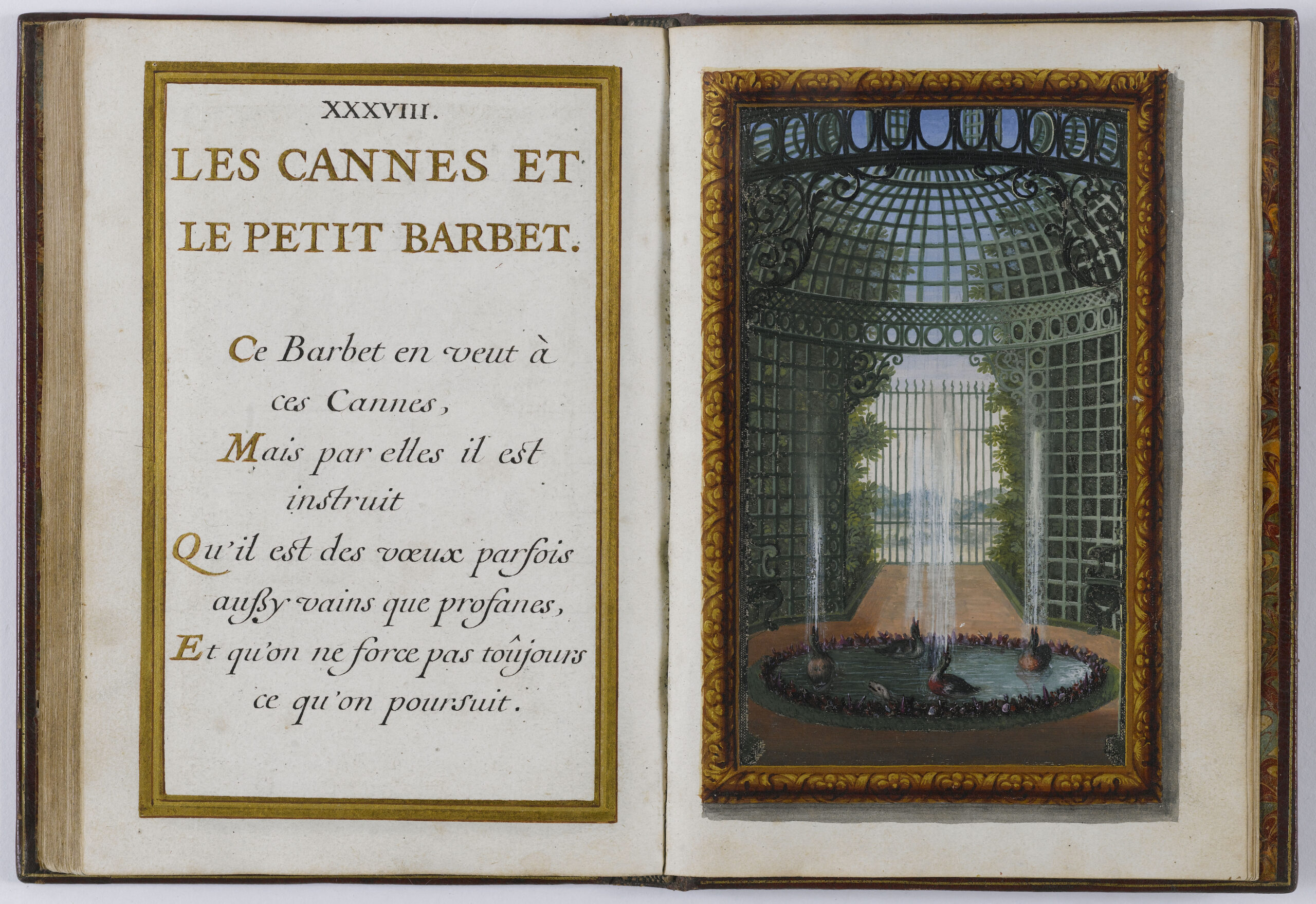 At the Labyrinthe’s completion, a book was compiled by Charles Perrault which included an engraving of each of the fountains by Sébastien le Clerc accompanied by an explanatory text by Perrault and the verses that had been written by the poet Isaac de Benserade. A special edition containing paintings of le Clerc’s pictures and of Benserade’s verses was prepared by Jacques Bailly.